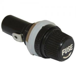 Panel mount screw apart black fuse holder with round top. Complete with washer and dress ring. Mounting hole : 15mm dia, Length 50mm Suits RWB192/193 panels. Fuse not included.