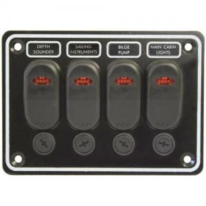 Extremely weather resistant black textured alloy switch panels with LED illuminated rocker switches with weatherproof gaskets. Each switch is isolated by its own fuse which has an "o-ring" seal. The panels come pre-wired and include a backing gasket, blackened stainless steel fastening screws band a label set which covers the most common accessories. Suits both 12 and 24 bolt systems. Vertical panel in 3 or 6 switch, 4 switch in horizontal configuration.